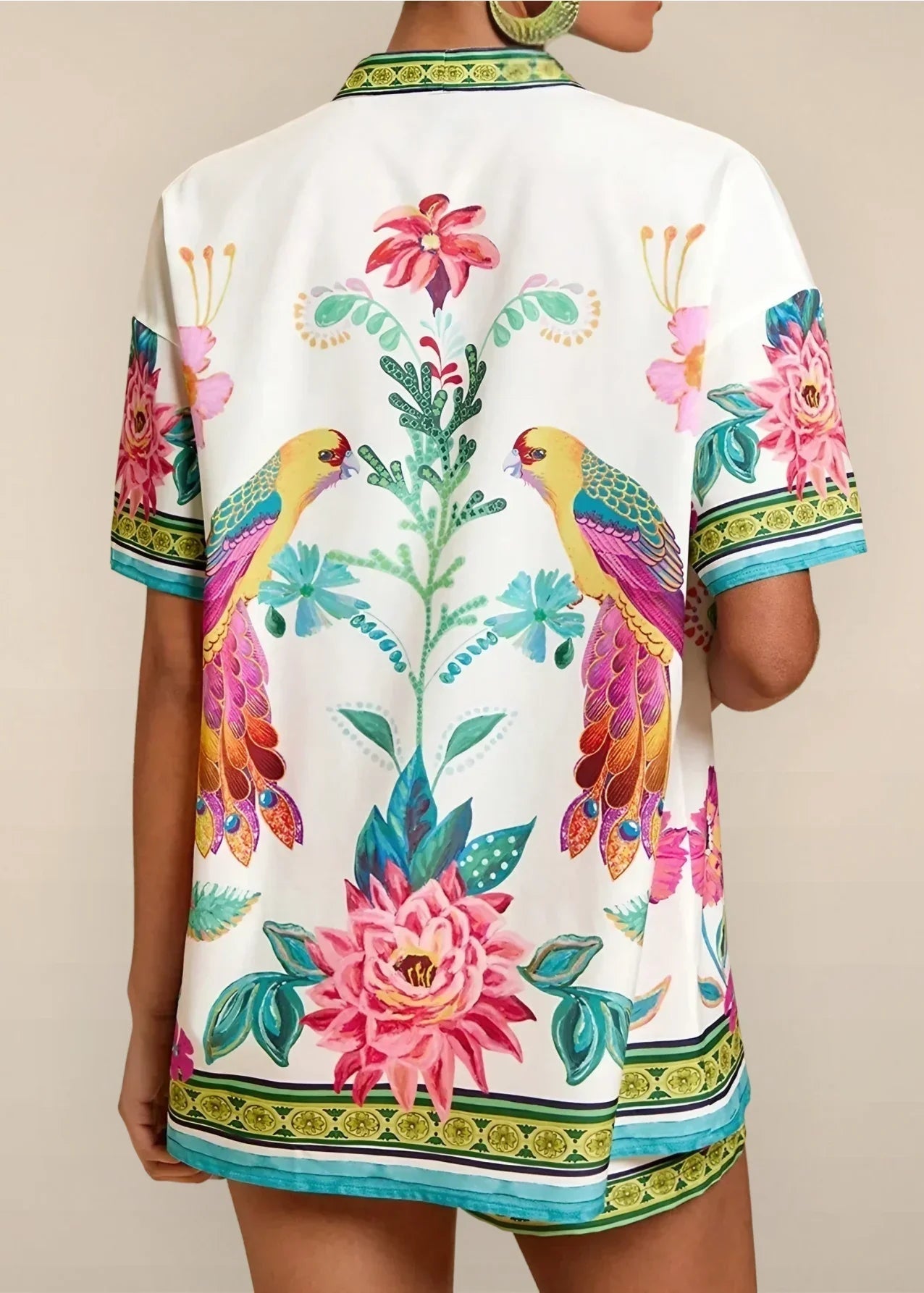 Avec l’ensemble Linde, vous profitez d’un équilibre parfait entre confort et élégance. Ce deux-pièces associe une blouse ample et raffinée à un short taille haute qui met en valeur la silhouette. Confectionné dans un mélange de viscose souple, le tissu est léger et agréable à porter – idéal pour les journées ensoleillées.